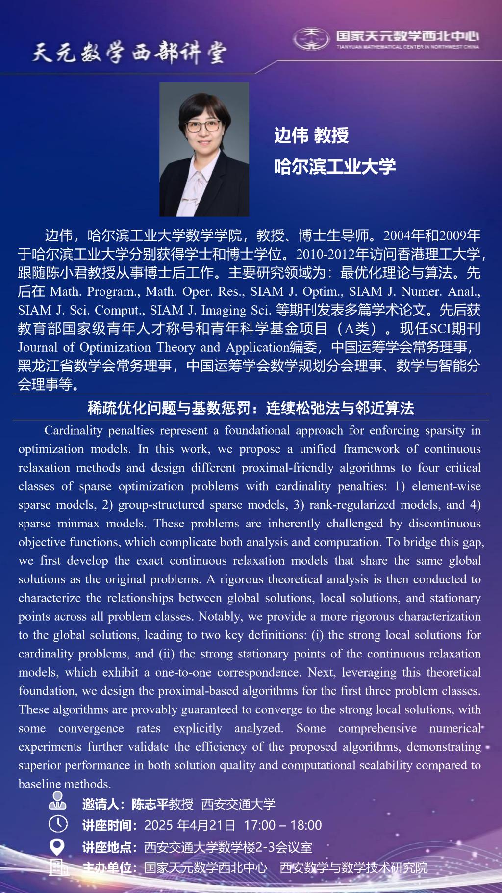 【天元数学西部讲堂】哈尔滨工业大学边伟教授学术报告